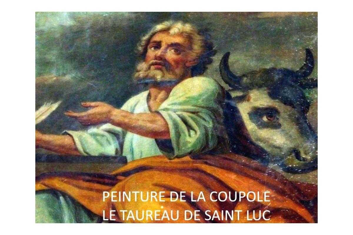 L'intérieur de la coupole (construite au XVIII ème siècle) est une féérie de couleurs et d'un symbolisme saisissant. Sur les angles, sont peints les quatre évangélistes, identifiables, à partir des attributs du tétramorphe, tels qu'ils ont été décrits par Jean de Patmos dans le dernier texte du nouveau testament (2): le taureau de St Luc , le lion de St Marc , l'aigle de St Jean, et l'ange de St Mathieu.